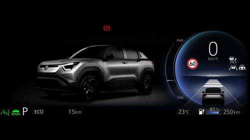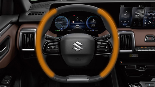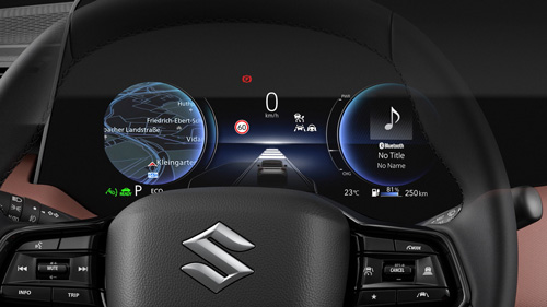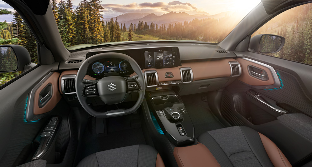 e VITARA tipptehnoloogia x seiklushimu-disainikontseptsioonil põhinev kujundus jätkub ka auto sees. Ühtseks tervikuks liidetud digitaalne näidikuplokk ja keskekraan, stiilne keskkonsool, salongi meeleoluvalgustus ja erilise kujuga rool peegeldavad elektriauto tehnilist edumeelsust. Üle kogu armatuurlaua ulatuv horisontaalne polsterdus, kõrgele tõstetud keskkonsool, neli ruudukujulist ventilatsiooniava ning mugavad ja hästi toetavad esiistmed väljendavad aga seiklusvaimu ja maastikusuutlikkust.